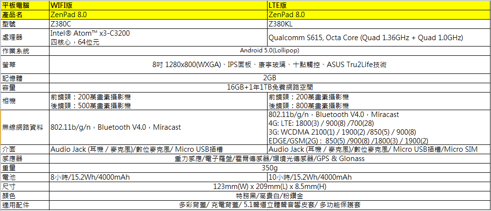 ZenPad 8.0 Z380KL 與 ZenPad 8.0 Z380C 規格比較(點擊圖片可看原始大圖)