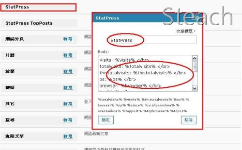StatPress的填寫函數可以比對下列說明,每一行後面記得要加上</br>換行,