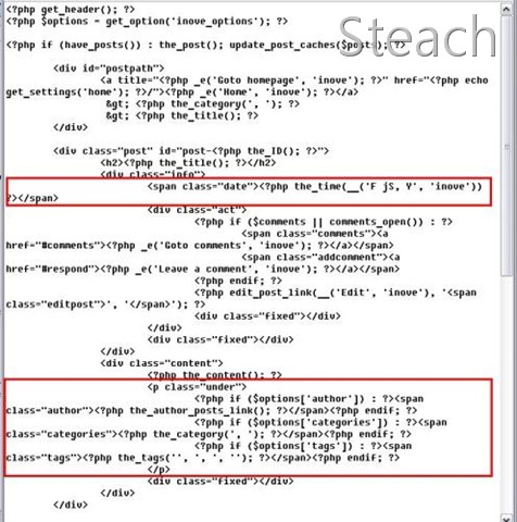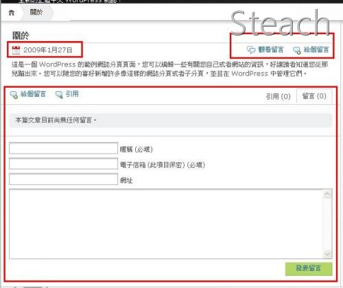 <?php /* Template Name: about */ ?>我舉例定義為about,你也可以定義其它的名字,然後開始找尋你要刪去的語法,像剛剛給各位看的,首先多了日期,所以將F js,Y那行讀取日期的語法刪去,再來是留言者,文章分類,以及標籤,刪掉即完成,儲存後再上傳至你佈景的資料夾內 ※站長只是依我的佈景作範例修改參考,你的佈景可能會有更多多餘的語法 謎之聲:站長,你都騙人,那"留言"還有他的表單框呢?不用刪哦,這樣哪裡乾淨了,我要退貨!! 站長:……………..不要吵XD…靜靜往下看吧你!!