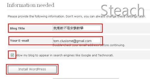輸入你要的部落格標題及管理員信箱,並勾選是否讓搜尋引擎搜尋到,