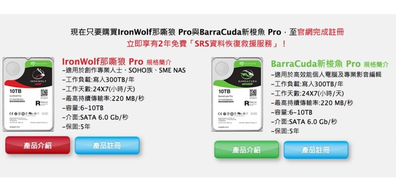 目前 Seagate 全新推出的守護者系列產品中,包括那嘶狼 Pro 與新梭魚 Pro 這二款系列產品都是免費隨硬碟附有 2 年 SRS 資料恢復救援服務,購買後只要到官網完成註冊,就會有2年「SRS資料恢復救援服務」,所以記得要去註冊哦。