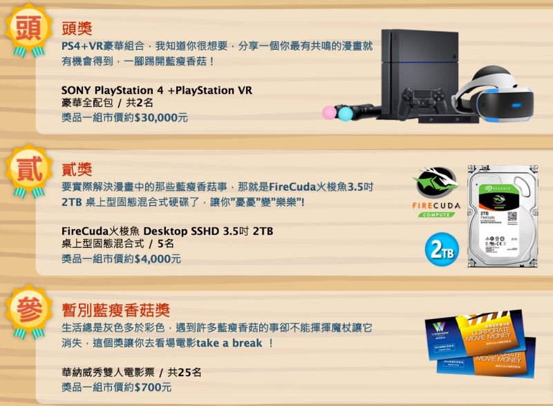 要抽出的獎品真的蠻不錯的,最大獎有 PS4+PS VR,第二獎有硬碟,最小獎也有電影票雙人份,趕快去參加啊!