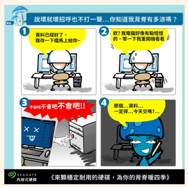 目前 Seagate 也舉辦了一個網路活動,用四格漫畫讓大家更加了解硬碟資料的重要性之外,也有機會可以獲得豐盛的大獎,快去活動網址選出你最有共嗚的四格漫畫吧!