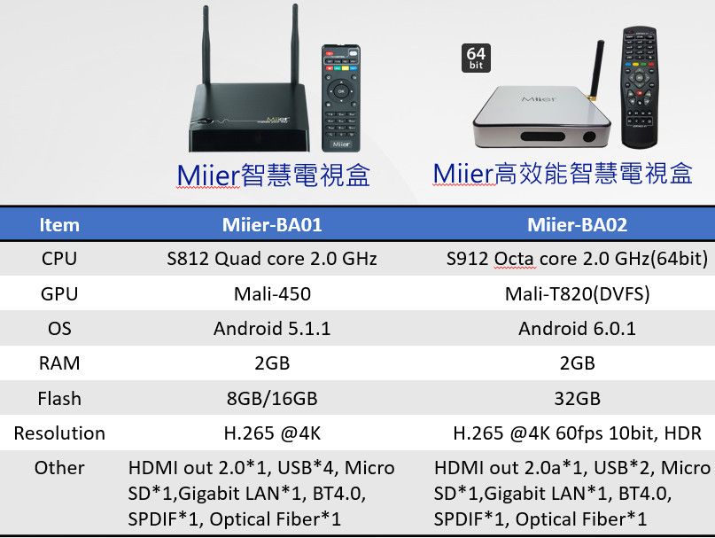 二代 Miier 智慧電視盒規格差異表: