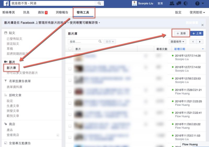 安裝好 OSB 軟體後,我們先到自己的 FB 粉絲團取得串流金鑰及網址,首先,進到粉絲團的「發佈工具」> 影片庫,再點擊右邊的「直播」。