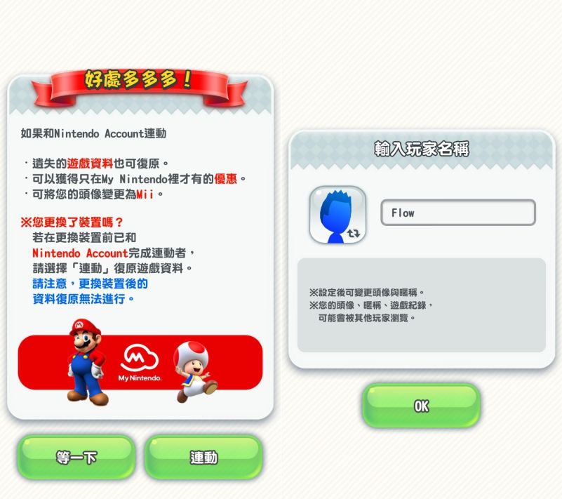 這款 Super Mario Run 真的比想像中的內容還要多非常的多,只能在連線的狀態下進行遊戲,且會需要有玩家名稱,如果你會有跨裝置玩或是換設備的疑慮,建議是註冊一個任天堂的帳號,遊戲資料才會跟著走。