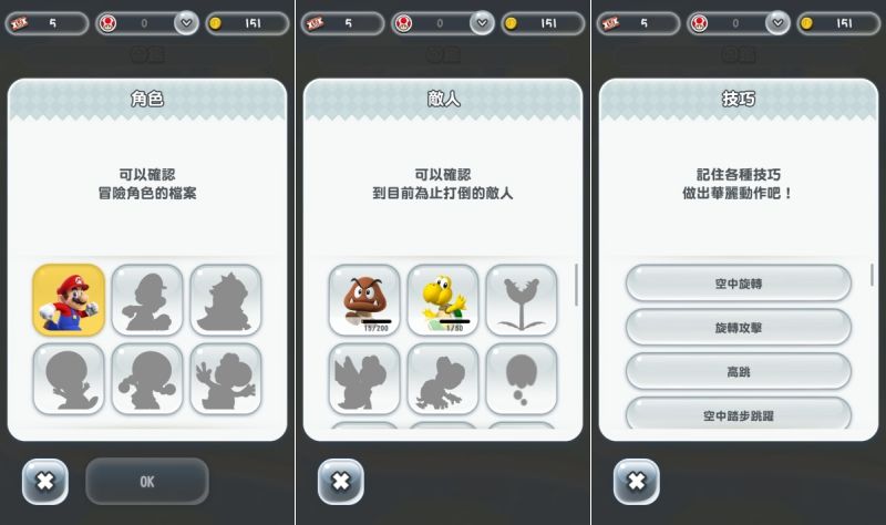 角色檔案、敵人會隨著關卡慢慢的收集到圖鑑,如果你忘記還有哪些特殊技巧,也可以看一下這裡。