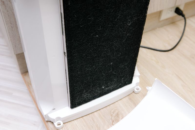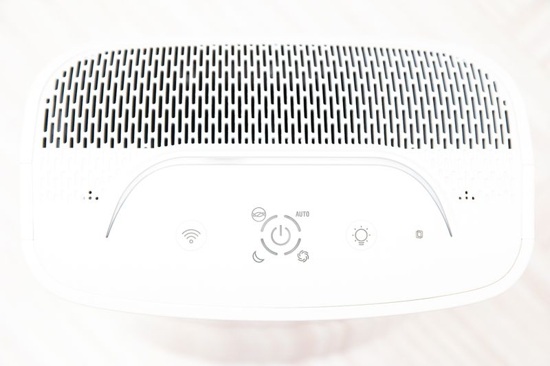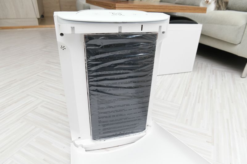 我們先從機身來看看,正上方是出風口,過濾後的空氣都是從上方出來的,而二側有二個四孔三角形,右側為 VOC(揮發性有機物)偵測器,隨時都可以透過手機 APP 來查看這些數值。