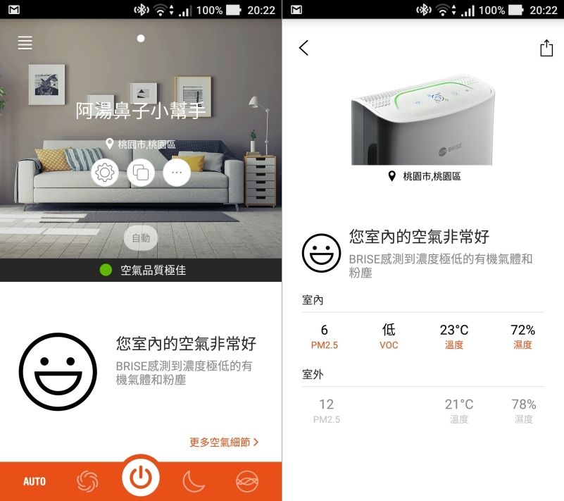完全初步設定後,接下來就可以研究一下這 APP 究竟可以做些什麼,在首頁我們可以查看目前的空氣品質及相關的狀況,讓你更清楚的知道家中的空氣狀況,並且提供你所在地目前戶外的狀況,想開窗通風前就可以先看一下再決定。