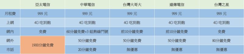 雖然亞太電信的網外/市話還是仍有限制,不過我們來比較一下各電信業者的 999 元資費方案,雖然大家都是吃到飽,但可以看到網外的部份,除了台灣之星贈送 80 分鐘之外,其他業者皆為 50 分鐘,而亞太電信則是不分網外/市話,上限達到 1,900 分鐘,非常的驚人,這對於通話量需求很大的業務及經理人們來說可是差非常多,雖然各家業者都分別有針對 4G 吃到飽各有不同的優惠方案,但論「語音通話」來說,應該目前沒有半個方案可以敵的過亞太電信這限時優惠的方案了。
