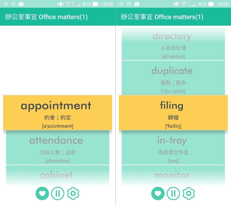 背的方式主要是像這樣,可以一個個往下滑,預設每滑一個單字都會發音一次,你可以跟著唸再搭配音標,只要你夠熟音標,其實只要會唸就大概都拼的出來。