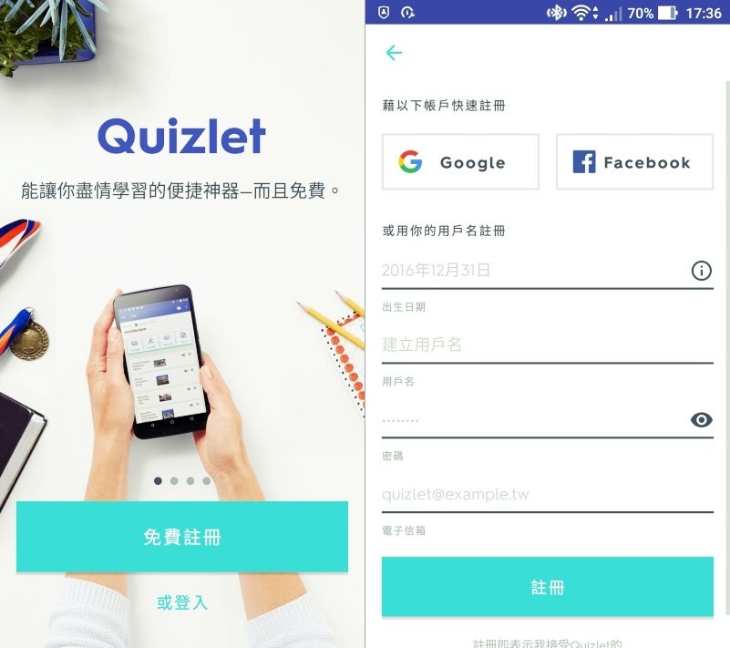 由於這是可以創建自己的學習集,所以是需要註冊一個帳號,不過你很懶的話,就直接連動 Google 或 Facebook 就可以了,另外,除了APP版本,也有網頁版可以使用,對於建立學習集更加方便。