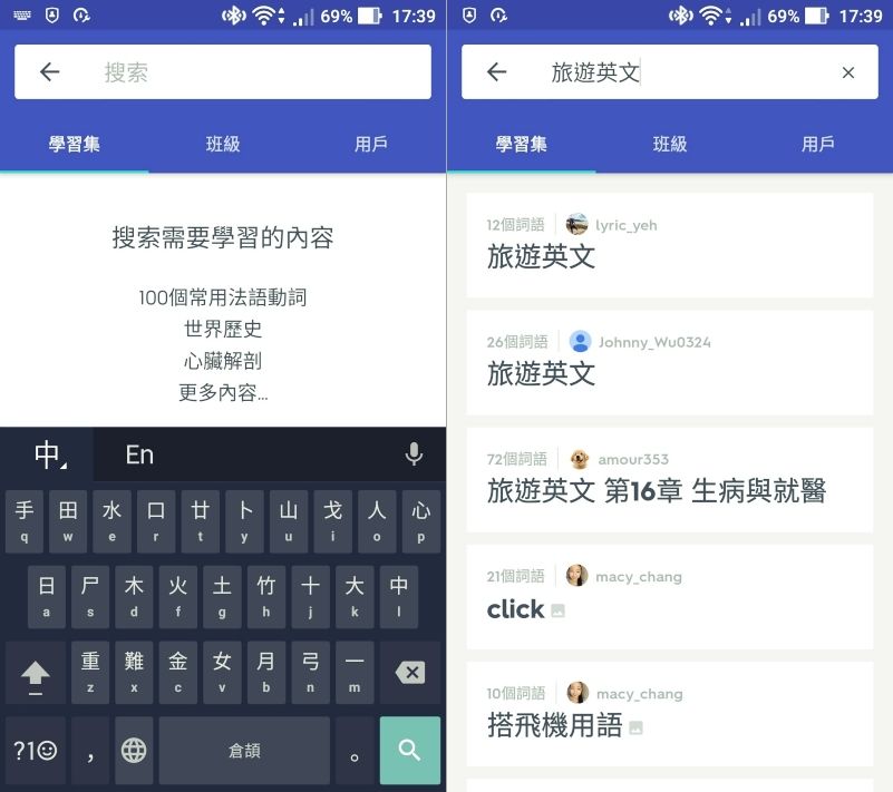 比如我透過搜尋,找「旅遊英文」,就會看到其他人所建立分享的學習可以直接閱讀使用。