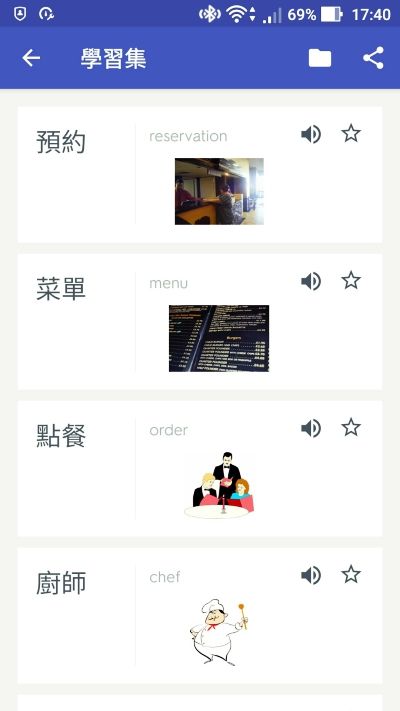 而字卡的學習方式像這樣,先顯示譯文後,點擊會顯示原文及圖片(看有沒有加入),以及可以聽發音和加入星號(書籤的意思)。