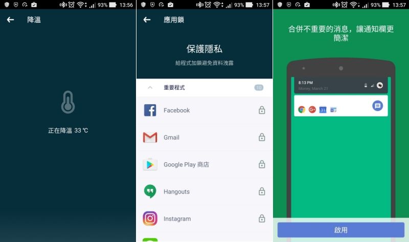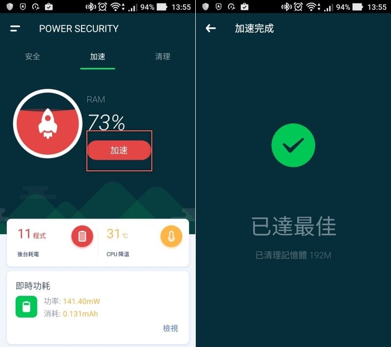 加速的部份主要是針對記憶體優化,這個不需要沒事就去按,因為有些程式其實就讓他在背景運作是好的,如果一直清除只是耗電在重新啟動一些 APP,所以建議大家可以在覺得手機變慢時再去清除即可。