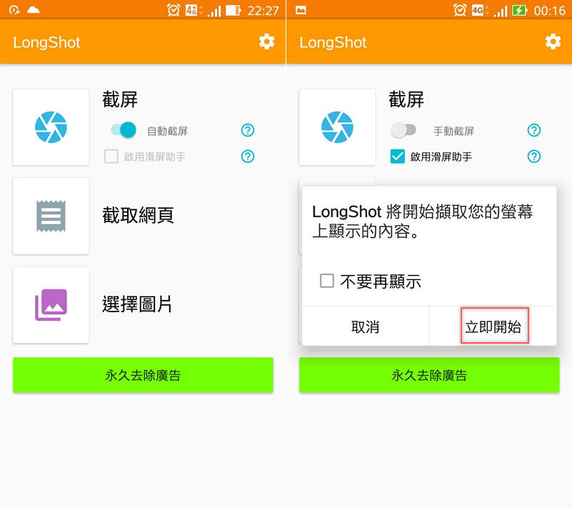 首頁列出三種製作方式:截屏、截取網頁、或是選擇手機裡的圖片。先來示範截屏,可以選擇自動截屏或啟用滑屏助手,啟用後會要求擷取螢幕上的內容。