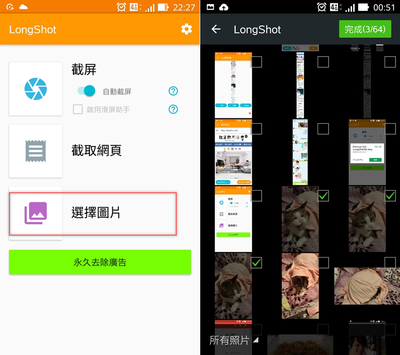 最後來試試手機裡的圖片,選擇圖片點擊右上角「完成」,最多可以拼 64 張圖片(應該沒有人有需要那麼長的吧),然後選你想要的配置效果,其實不管選手動或自動,都可以到下一頁去編輯。