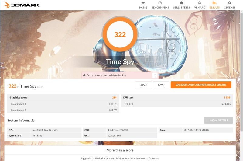 透過 3DMark 的 Time Spy 進行測試,獲得分數為 322 分。