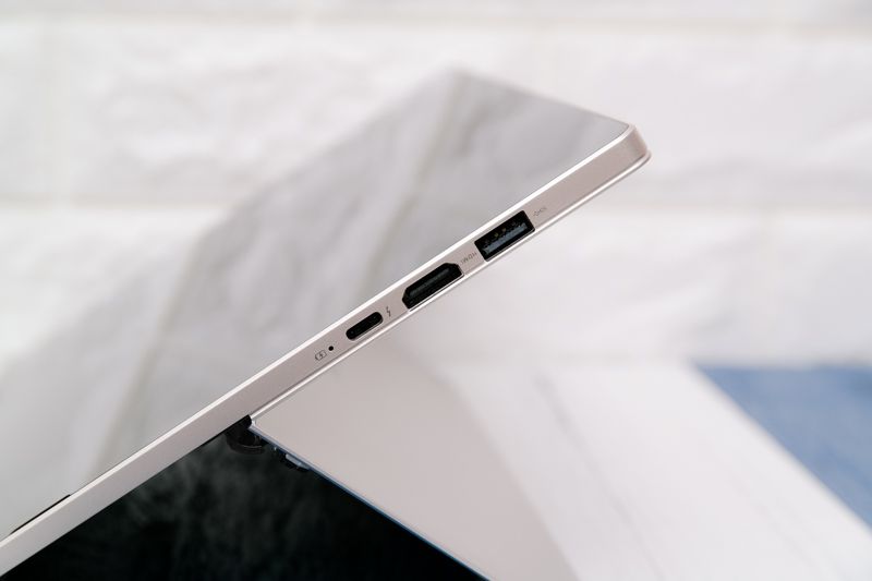 雖然輕薄,但和一般輕薄筆電有所差異的是,在 I/O 擴充上並沒有過於犧牲,在機身右側為 USB 3.0、HDMI(支援 4K 輸出)、支援 Thunderbolt 3 的 USB Type C(同時也是充電孔)。
