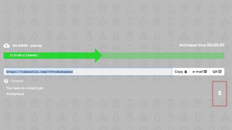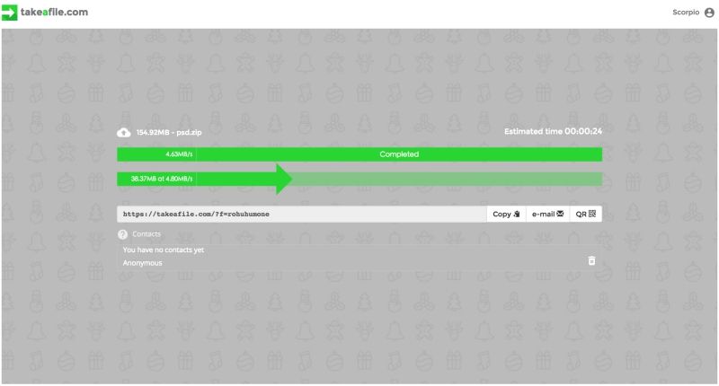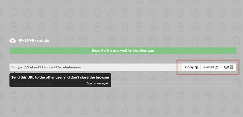 當你將檔案拖曳到中間畫面後,會出現像這樣的畫面,產生出一個專用的連結給你,你可以直接複製或是透過 Email、QR Code 分享連結給你的朋友們。