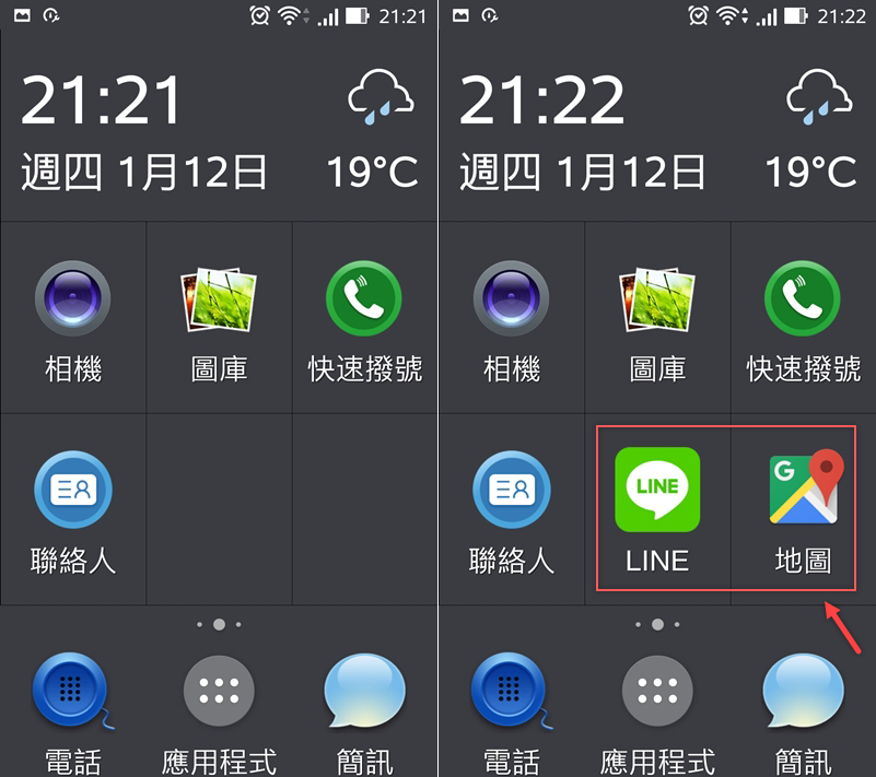 主頁就是以清楚的圖示與分色來設計的按鈕,上半部除日期時間外還有即時氣象,提醒長輩要看天氣穿衣服。空白的部分可以拖入慣用的程式,這邊阿湯是選擇聊天軟體 Line 及 Google 地圖。