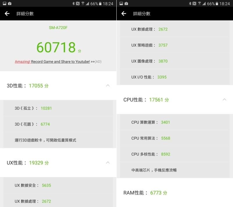 在安兔兔的部份獲得 60718 分,以中階手機來說算是表現不錯,但重點還是阿湯常提到的,跑分僅供參考,主要還是要看系統調校的好不好,否則分數再高都沒有用,所以還是要跟大家說 Galaxy A7(2017)很順暢。