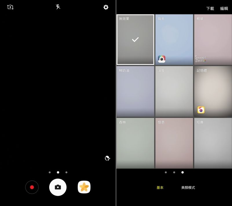 相機的操作部份,也拜新介面所賜,操作非常的直覺,你要做的就是「上.下.左.右」滑動,上下可以切換前後鏡頭,往右滑則是可以選擇基本濾鏡。