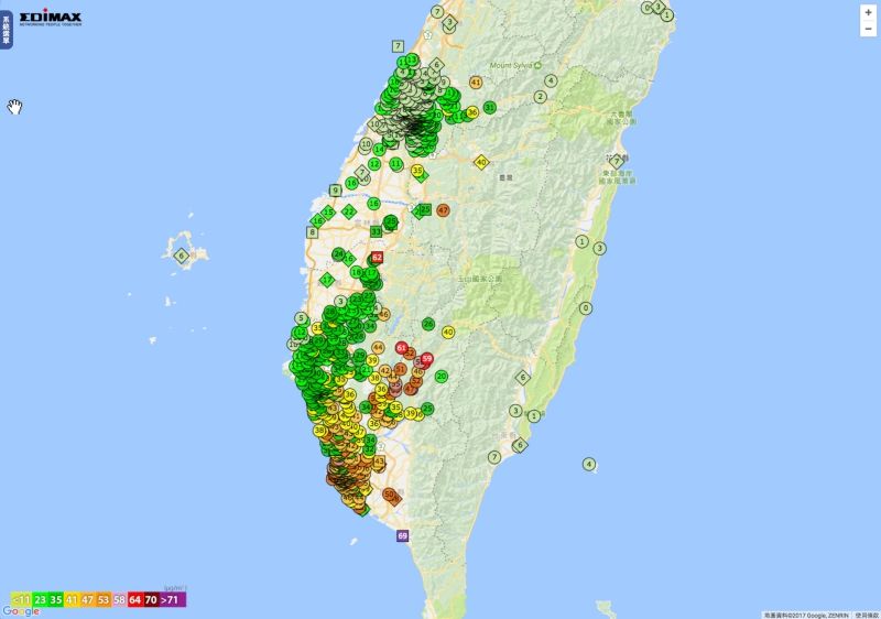 進入網站後直接就可以看到全台各地的空氣品質狀況,綠色基本上都是沒問題的,看到紅紅紫紫的就要擔心了,原則上空氣品質的 PM 2.5 最後要低於 35 以下比較好。
