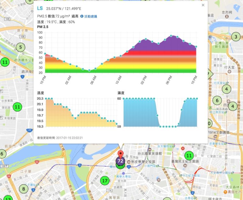 每個觀測點也都能點擊查看 24 小時內的空氣 PM 2.5 以及氣溫的變化。