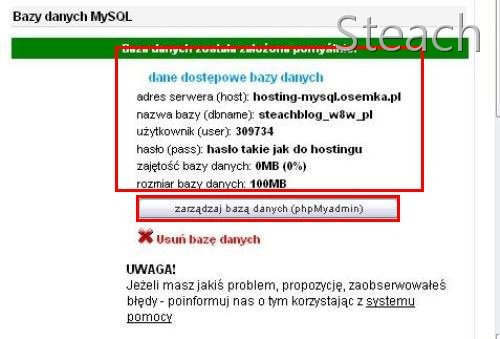 出現綠框表示創建成功,紅框內為SQL資料,密碼與FTP創建密碼相同,第2紅框即登入 phpMyadmin的網址