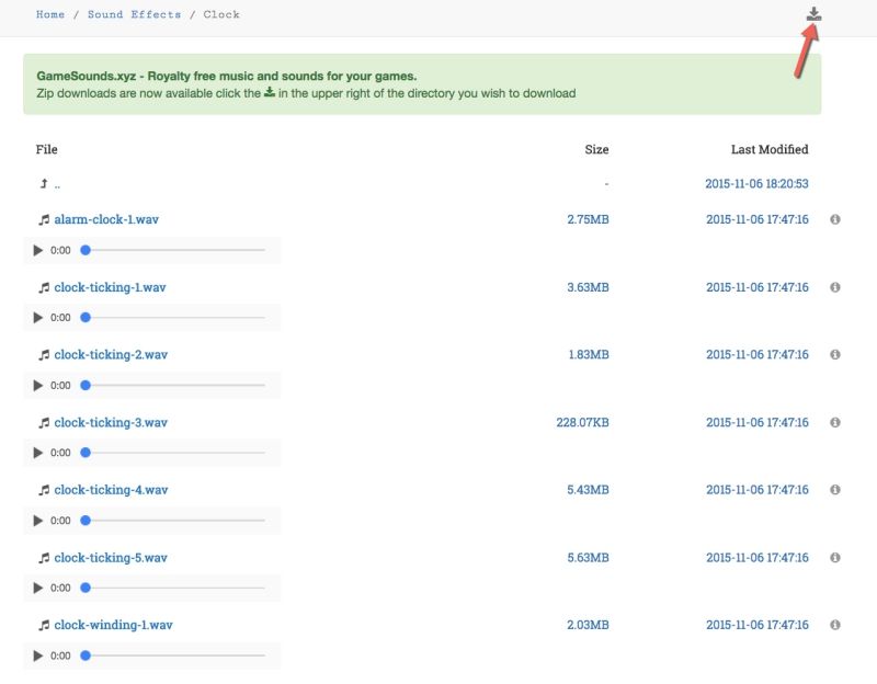 像是在上一個畫面裡我點擊 Clock 後,就可以線上聽看看這些音效是否符合你想要的,或者如果你又想要整個打包,那就右上角點下去吧!