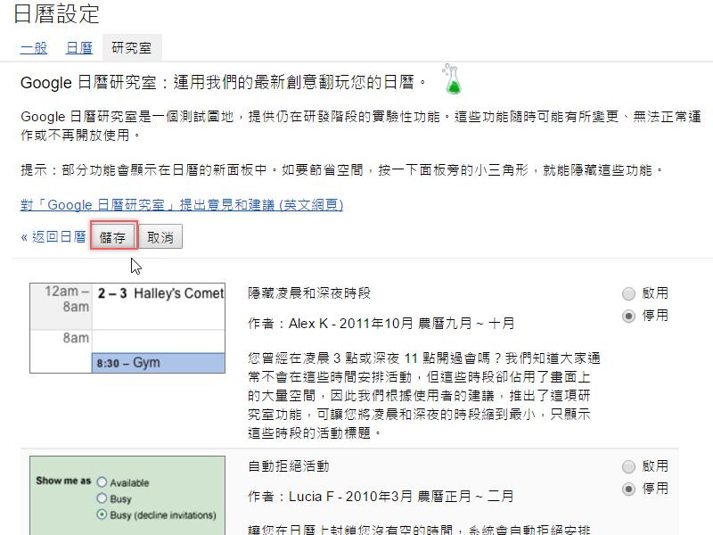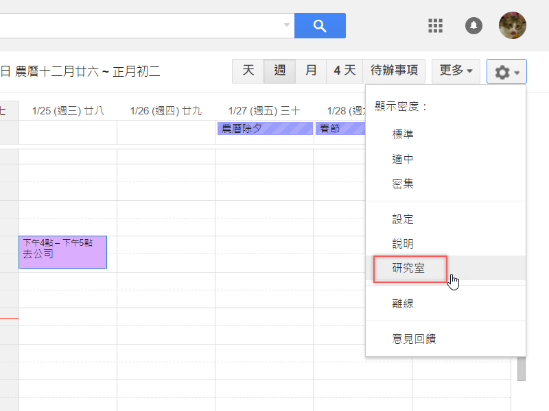 開啟 Google 日曆,從右上方設定清單中找到「研究室」。