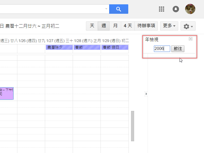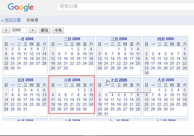 接著再回到日曆頁面,右上角就會出現年檢視功能,輸入要查詢的年份後,阿湯輸入 2006 (年齡曝光…)後按前往。