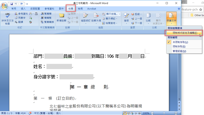以前工作時常常碰到把一份 Word 文件放在公司雲端給大家填寫,但很容易發生每個人填寫格式不同而造成傳回來的檔案內容亂七八糟不一致,原本制式的內容也容易被動到(無論是不小心還是故意),其實只要在文件發出去之前先啟動文件保護,限制大家可以更改的區域,就可以避免這個問題,同時也可以將修改權指定給特定人士(例如主管),這樣做之後相信文件內容就會整齊多了。