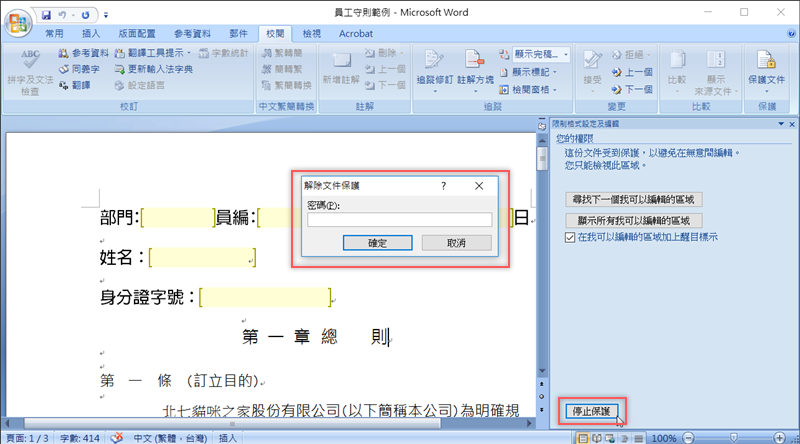 如果之後想要更改文件內容,只要點擊「停止保護」,輸入密碼解鎖即可。