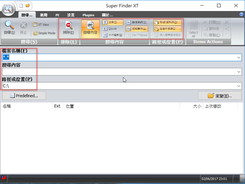 可以先設定搜尋內容,有文字、 Unicode 、十六進位可供選擇,也可以指定路徑與位置,接著輸入搜尋條件。