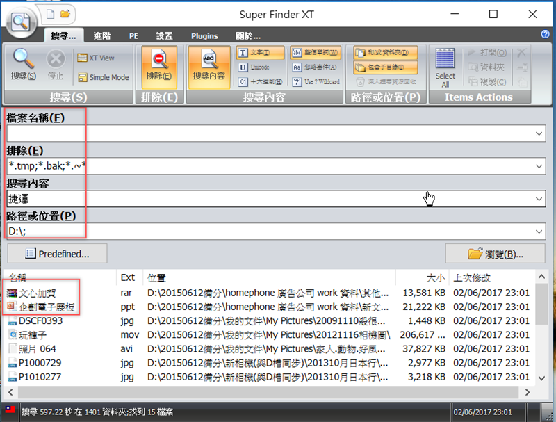 阿湯以搜尋文字內容為例,不記得檔案名稱,只記得內容有「捷運」兩個字,位置應該在 D 槽,開始搜尋,結果跑出了十五個檔案,但是除了紅框之外,下面的 jpg 、 mov 、 avi 檔內容都沒有「捷運」啊,不知道為什麼會跑出來。