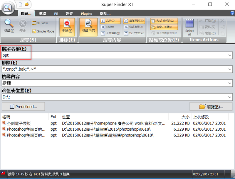 再進一步指定「 ppt 」檔好了,跑出來三個檔案,但實際點進去只有第一個符合結果,後面兩個阿湯開啟後查詢確定沒有「捷運」兩字,可見使用這個程式還是容易會有不相干的結果產生,但如果已經找到原本要找的檔案,阿湯是覺得沒差,找到之後隨時可以按停止搜尋。