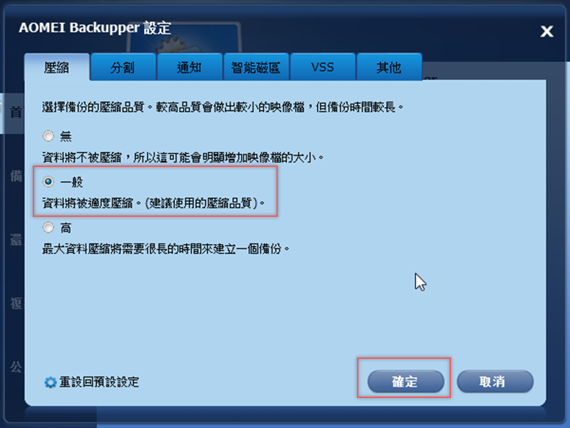 先來設定備份檔案的壓縮品質,考量到壓縮的時間與空間大小,建議用預設的一般品質就好。