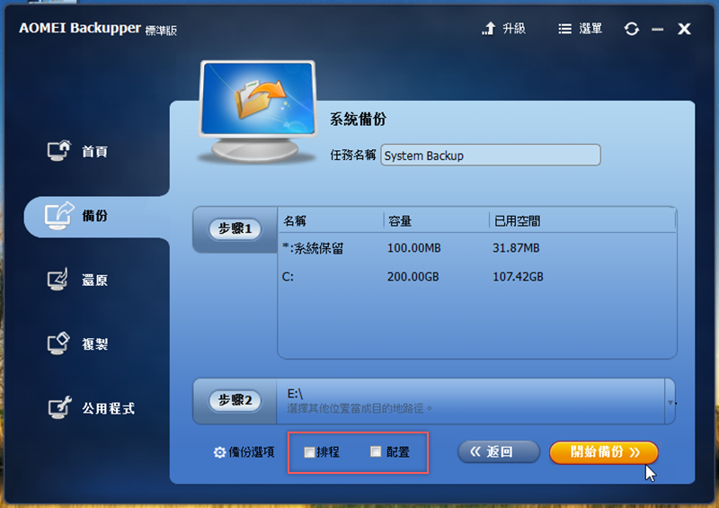 選擇要備份的來源與目的地,可以清楚看到系統的容量與使用狀態,也可以開啟下面的框框設置排程或其他配置。
