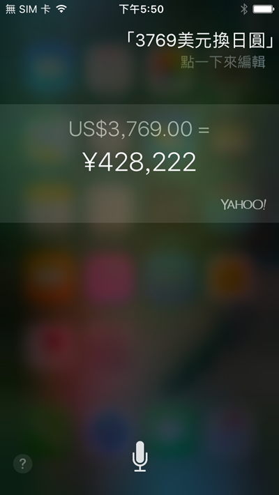 點右下角「 Yahoo !」的圖示會連結到奇摩網頁,這裡才會有進一步的資訊,其實要簡單換算幣值 Siri 還是蠻好用的,但真的要講清楚,碰上溝通不良的狀況就換個方式說說看吧。