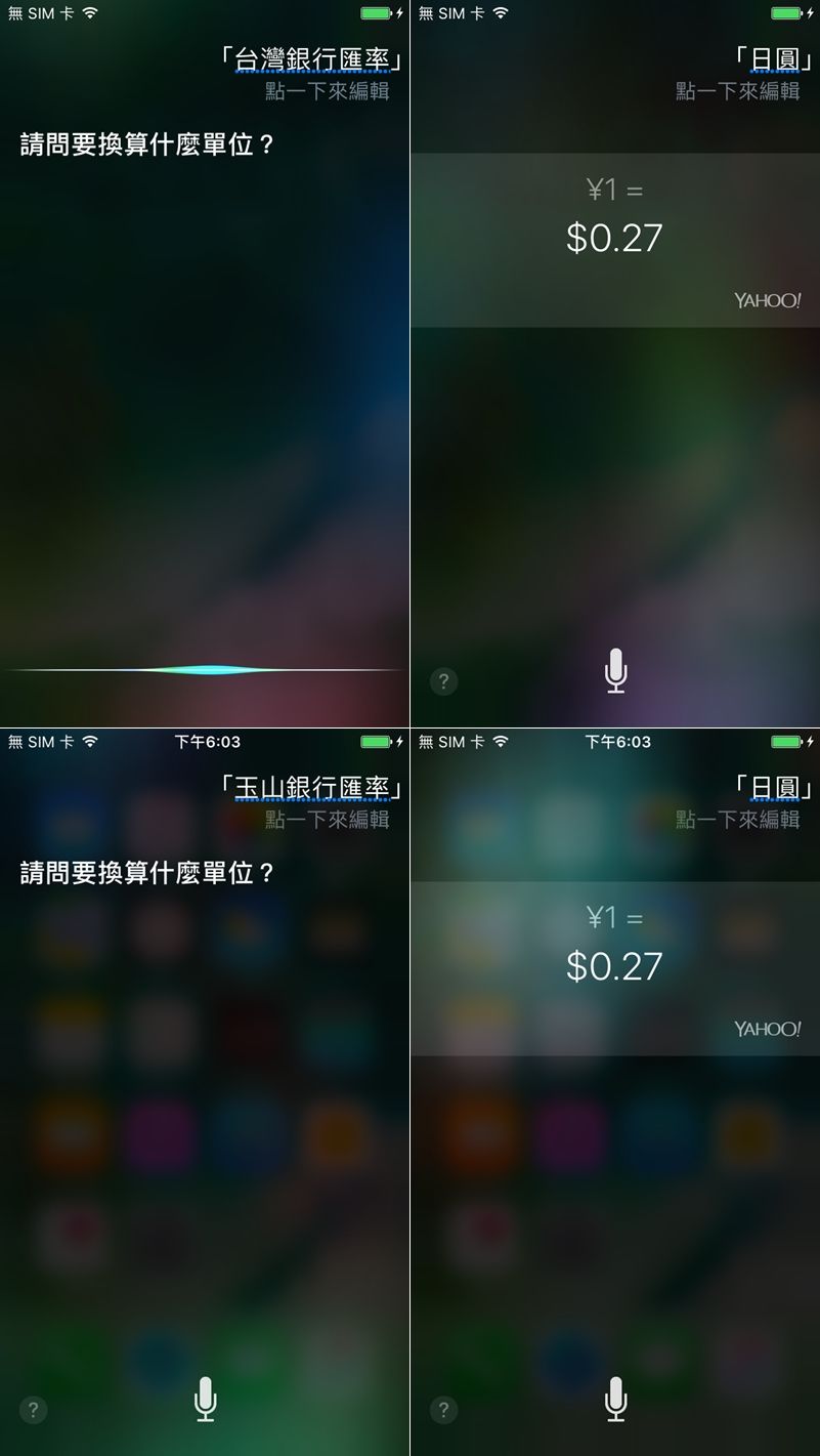 簡單問匯率兩個字, Siri 就會問你要查的幣值,再告訴它就好了,例如 1 日圓等於 0.27 台幣,可惜只到小數點後兩位。