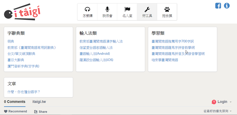 這裡有很多關於台語學習的網站,可以增長知識,比較特別的是還有 Android 和 iOS 輸入法的 APP 可下載,就可以在手機用台語跟朋友聊天了。