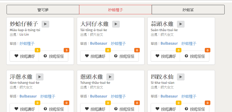 原來有六種講法,除了第一種直接翻以外,因為妙蛙種子背上的東西像蒜頭也可以叫蒜頭、洋蔥水雞,但還是「妙蛤仔種子」最受大家認同。