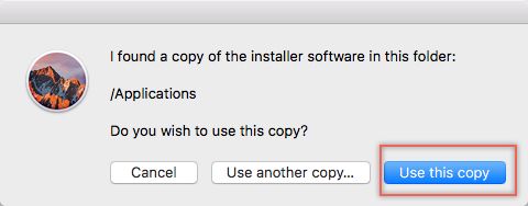剛剛如果有先下載好 Mac 系統,這步驟就會自動偵測到檔案,如果你是另外下載 10.10 的檔案,可以點 Use another copy 去選擇檔案。