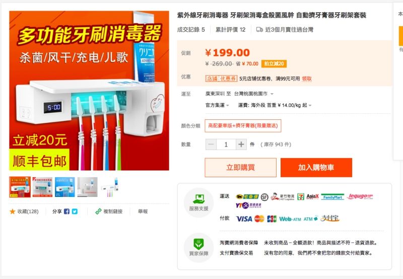 前陣子在 FB 上看到有人在分享韓國的牙刷消毒器,然後立馬就開始搜尋,結果發現韓國的牙刷消毒器基本上都是 220V,因此只好放棄,後來在淘寶上找了一下,也有不少大陸國產品牌,在搜尋的過程中,有不少牙刷消毒器僅只有消毒,沒有烘乾功能,最終找到一款算是取得平衡點的林央牌牙刷消毒器,大至上有賣的店家價格就是 199 人民幣。