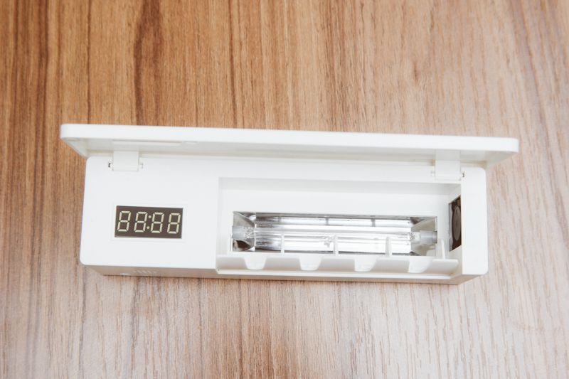 打開消毒器來看,左邊有計時器,右邊裡面為紫外線殺菌燈。