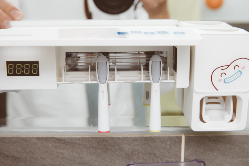 側邊有二個按鍵,當你刷完牙要消毒時就是按下 UV 鍵,就會啟用紫外線燈 5 分鐘,如果家中有小朋友也不用擔心在消毒過程中如果不小心掀開蓋子這件事,因為當掀開的時候消菌燈會自動停止,所以不會有被照射到的問題。