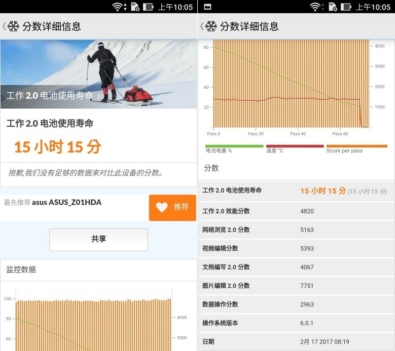 再來是大家很在意的續航部份,同樣透過 PCMark 工作 2.0 測試後,獲得 15 小時 15 分的超長續航力,這都得歸功於高通 S625 的省電技術再加上 5000mAh 超大電量,這續航等級應該也是阿湯目前測試下來最強的一台了。