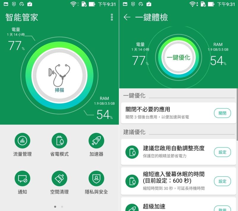 智能管家可以一鍵幫你優化系統,下方也會有一些建議優化的項目提供給你參考。
